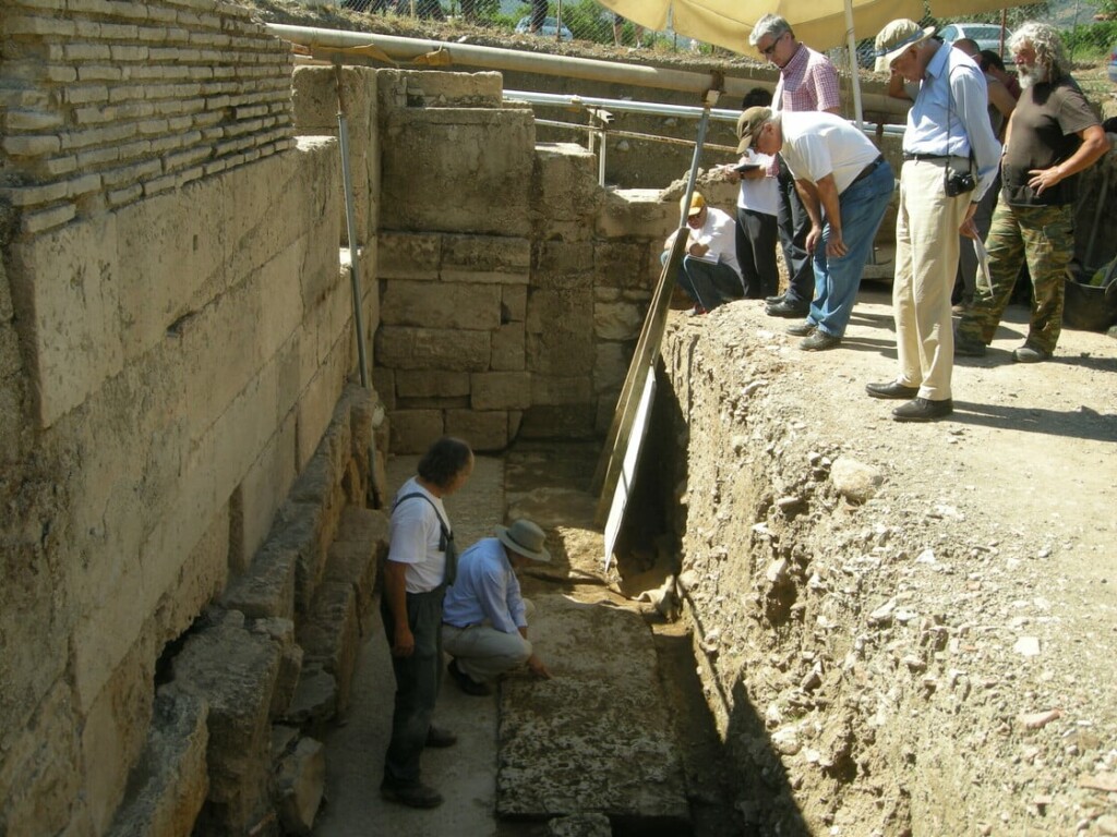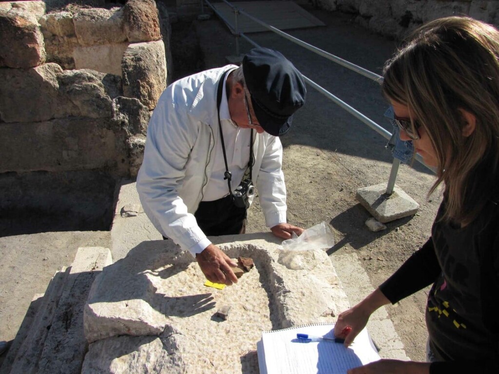 Επί τόπου εξέταση ευρημάτων στην ανασκαφή της σκηνής του θεάτρου του Ασκληπιείου.